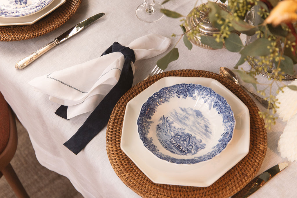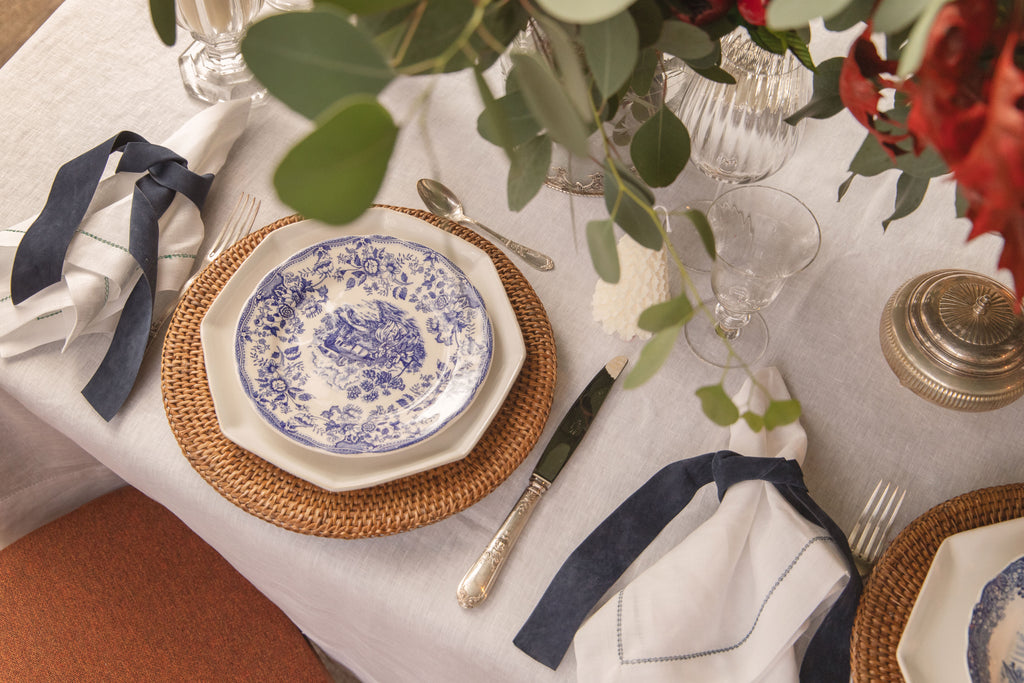 Mesas elegantes com a simplicidade de um detalhe de cor na bainha deste guardanapo...