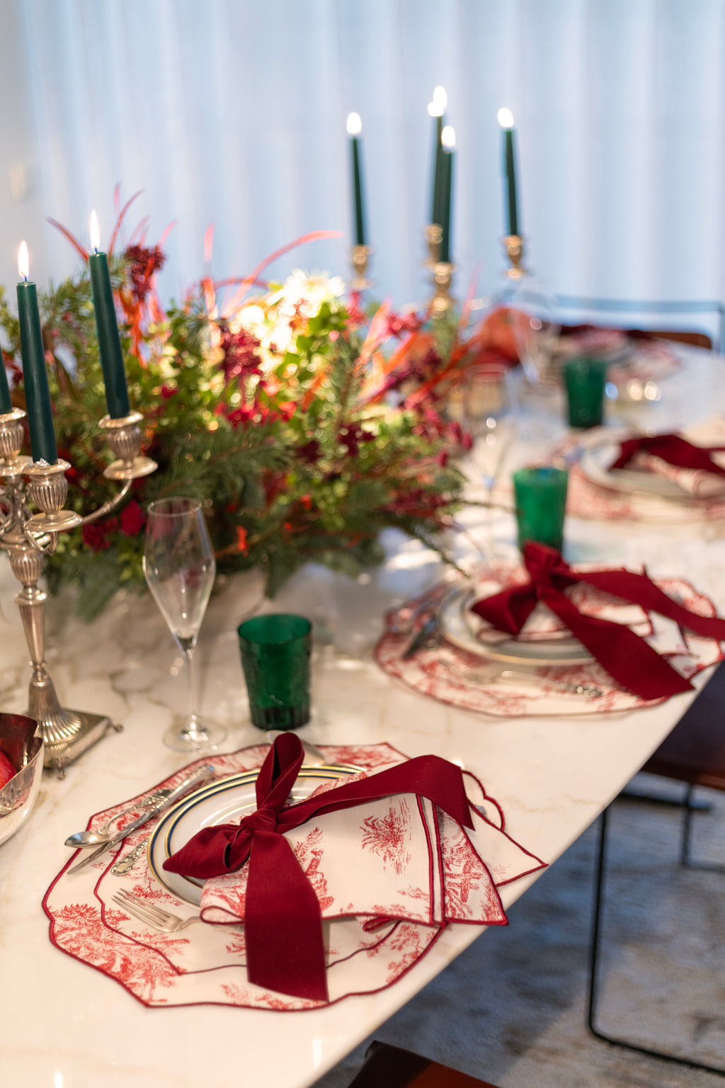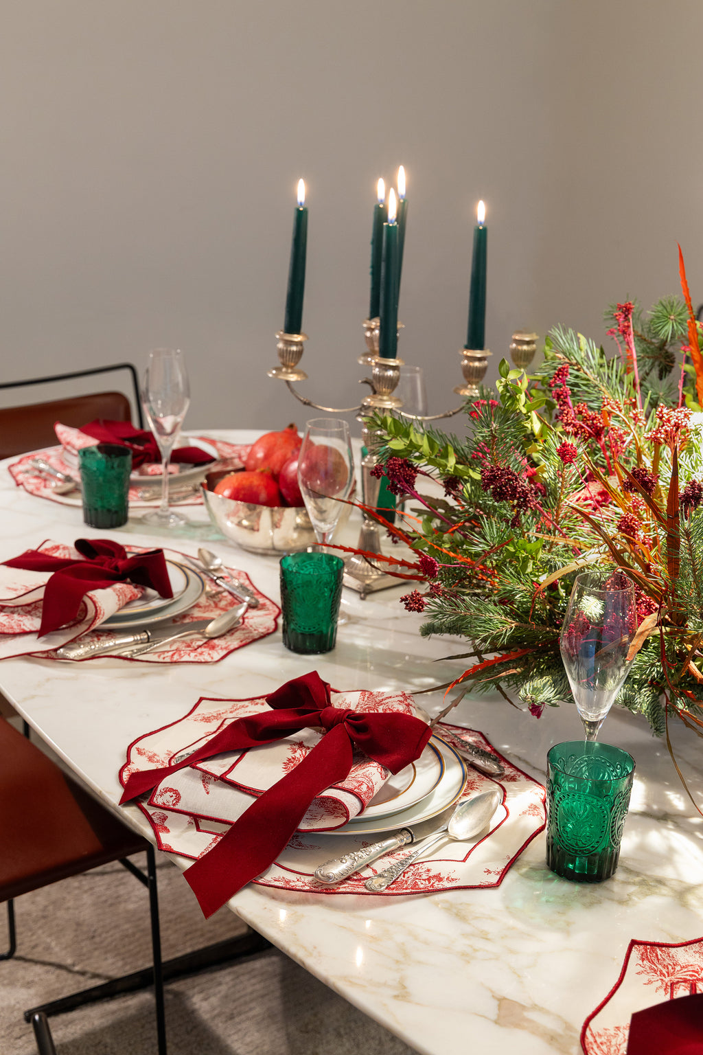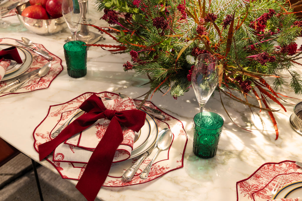 Faça mesas maravilhosas com o nosso conjunto individual e guardanapo em Toile de Jouy vermelho.