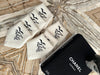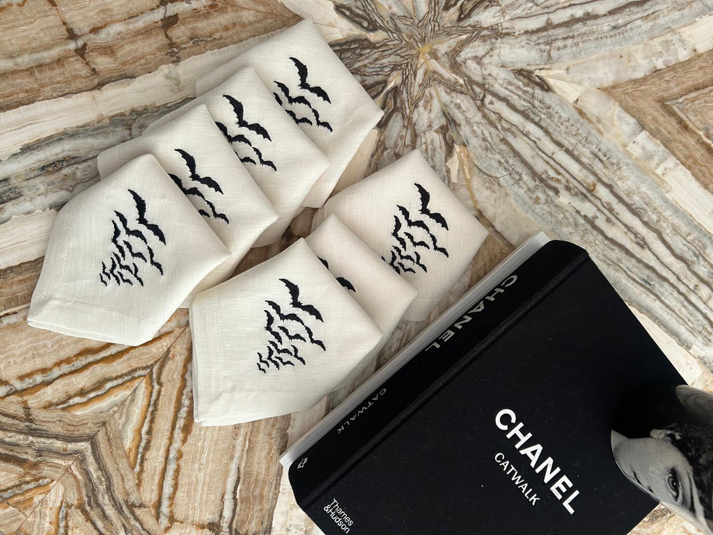 Conjunto de 6 guardanapos em linho perola com morcegos bordados a preto.