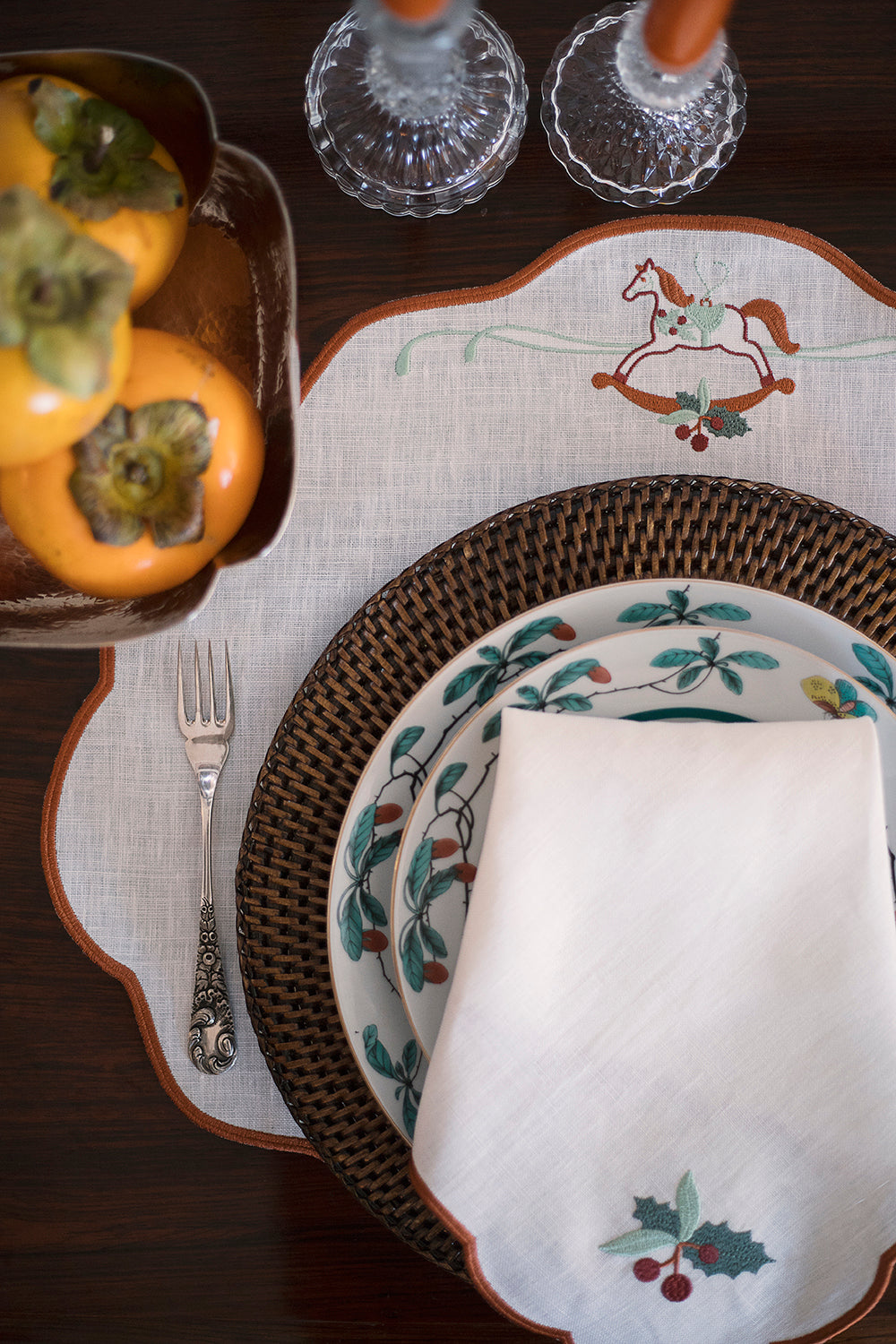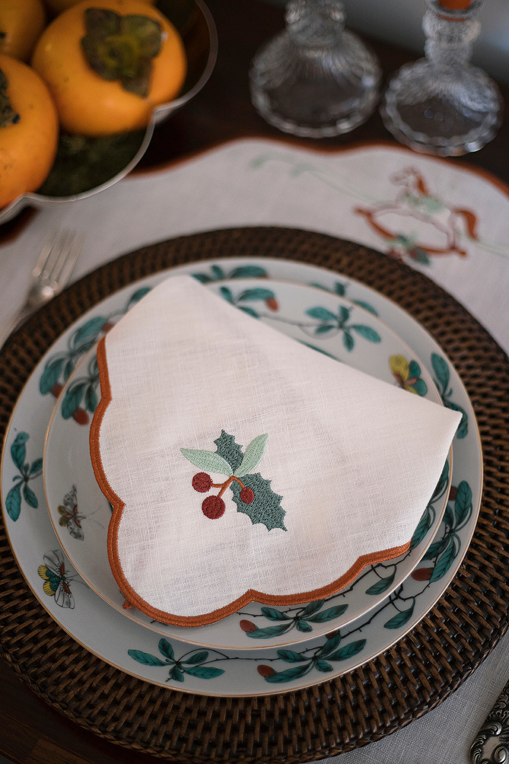 O guardanapo é quadrado, recortado nu, dos cantos e tem um azevinho bordado. Pode ser comprado com o individual ou isoladamente.