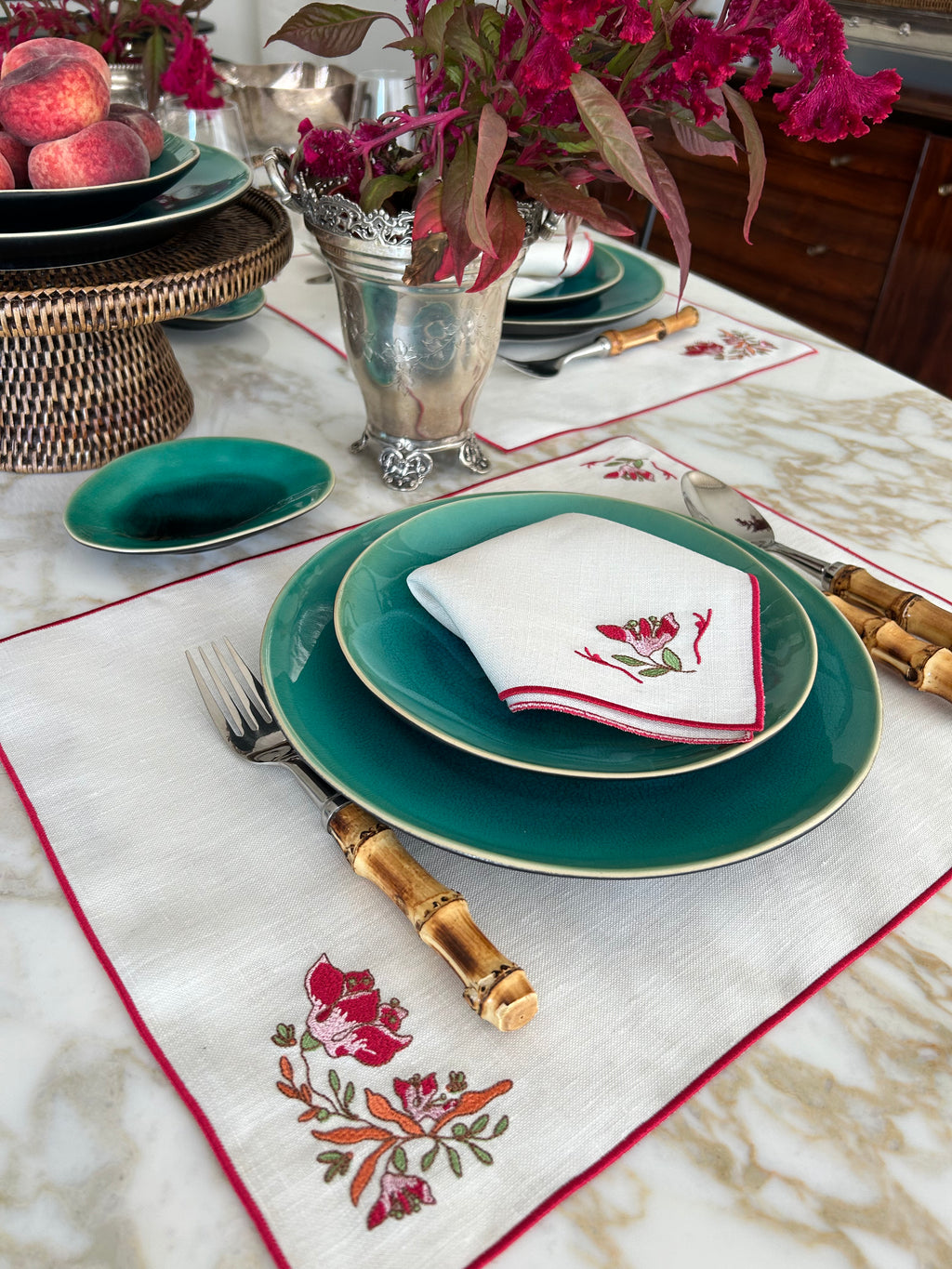 Linho da melhor qualidade, bordado floral e debrum à volta em rosa "pink"