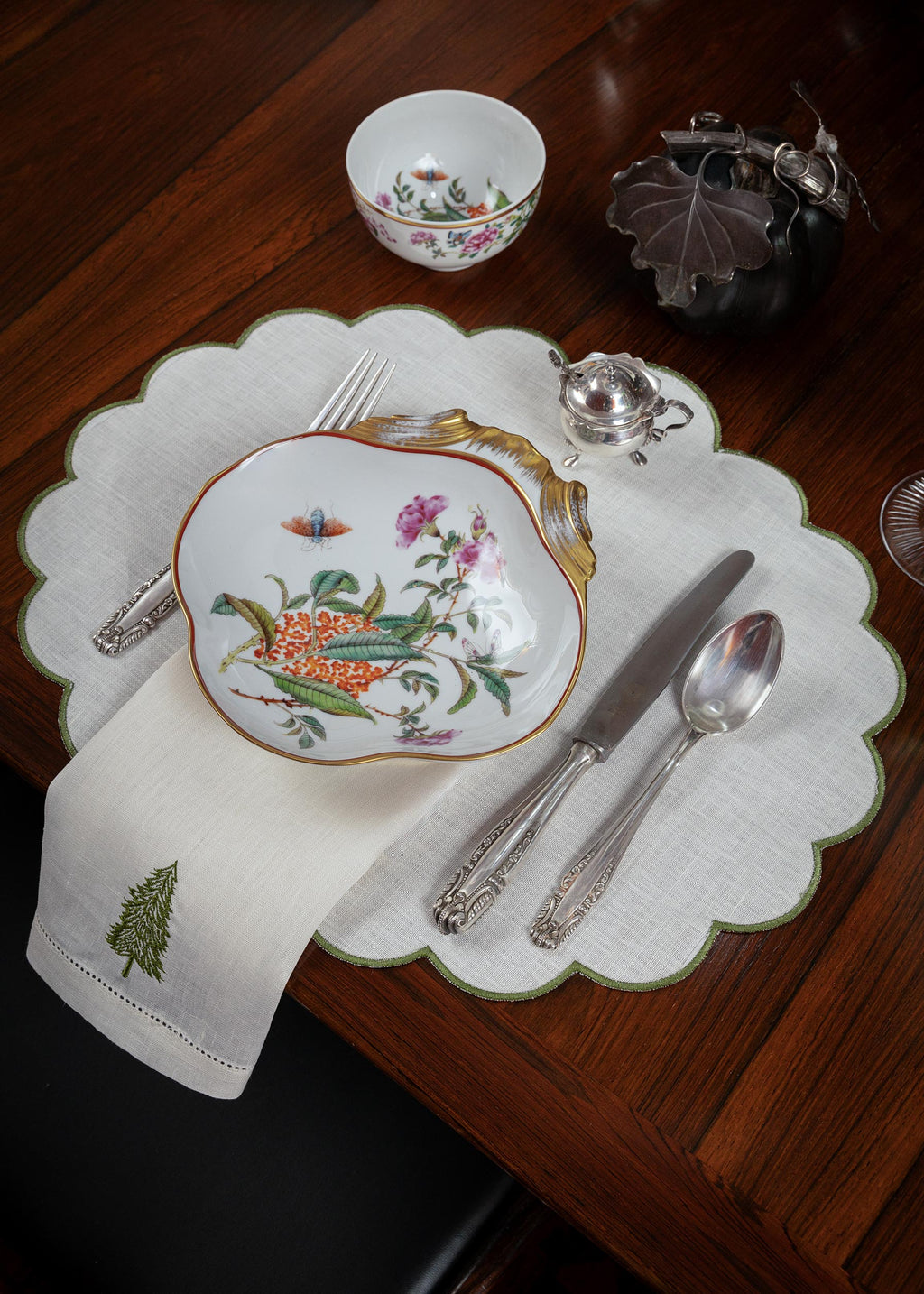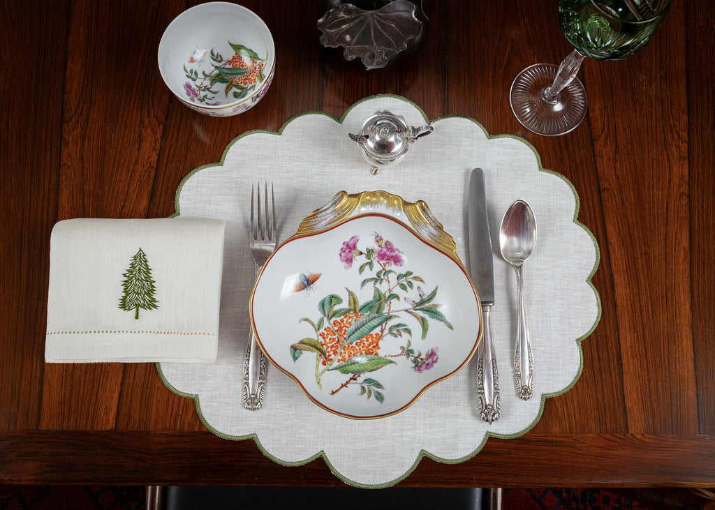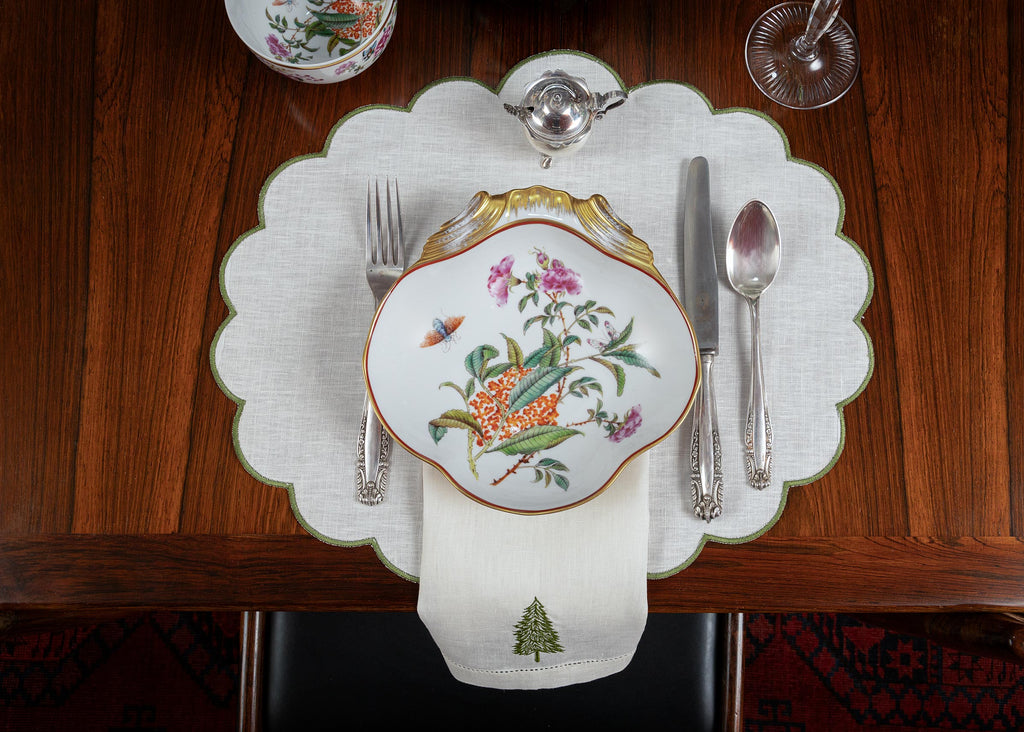 O individual tem um debrum ondulado bordado a verde que condiz que o pinheiro do guardanapo.