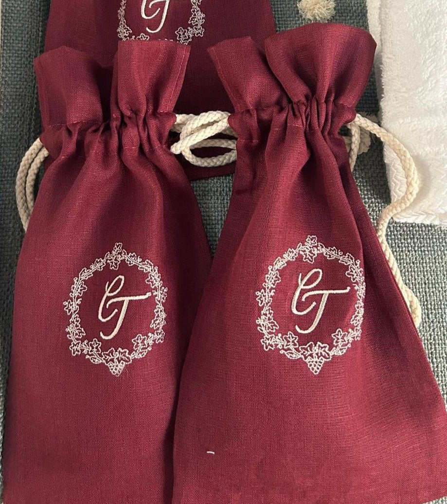 As nossas bolsinhas em linho ( vários tamanhos e cores disponíveis) podem ser personalizadas com a data, o monograma ou qualquer outro elemento.